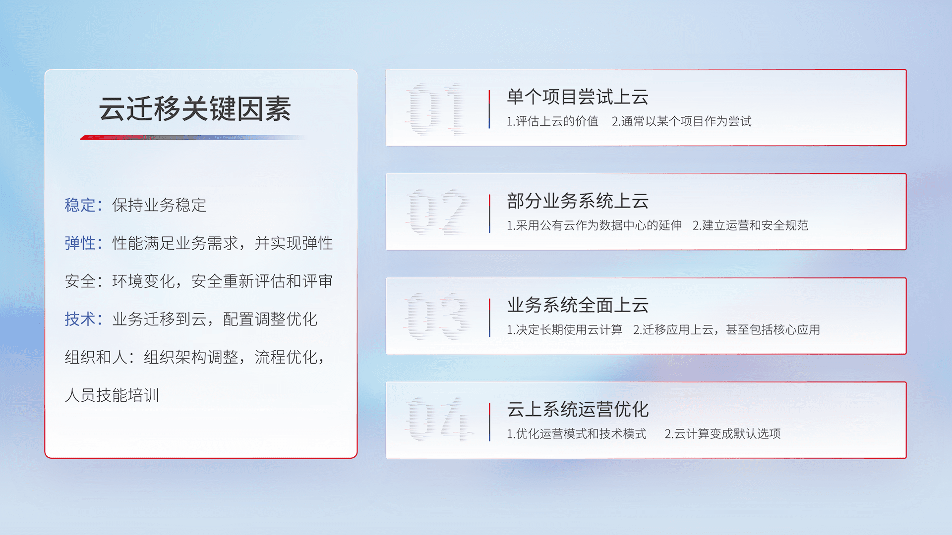 结合实际业务,,从规划设计、、云平台选型、、云原生改造、、、、数据迁移、、、、集成交付,,,,迁移全过程为客户识别最佳上云路径,,做好风险识别管理,,,设计网络架构、、身份权限、、、安全审计合规、、操作审计、、、日志审计、、、、监控告警策略、、、多站点容灾设计等,,,对云上基础设施进行整体规划,,,提升IT治理水平,,,,以满足弹性、、、、高可用、、高性能的需求。。。