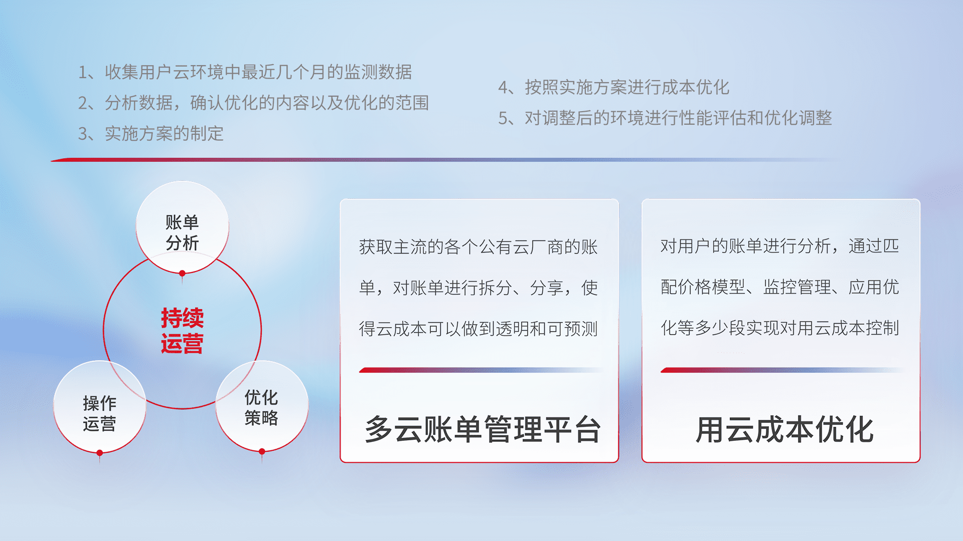 通过多云纳管,,,以统一的资源数据模型把客户的云资源进行抽象和封装,,,,进而实现对多云资源的统一操作,,,保障云资源管理的可靠性、、、稳定性与可用性。。。量身定制化运维内容,,,配置、、、、开发运维、、、、补丁管理、、、、备份、、、监控、、认证和访问管理、、、、审计和日常巡检等,,保障在用云过程中的可靠度,,,稳定度以及高可用率。。